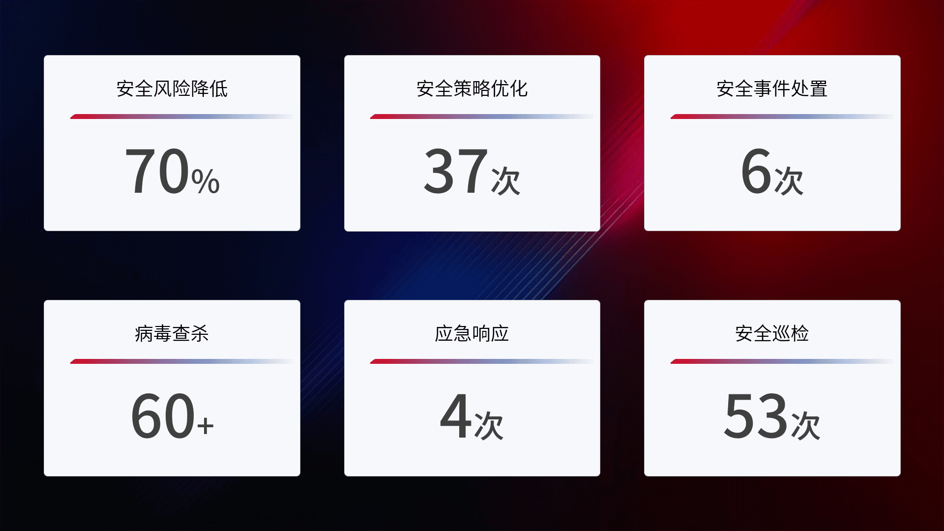 提供全面的安全事件报告体系,,,包括处置报告、、周报、、、、季度和年度总结,,,,结合持续监控,,,帮助客户深入了解网络安全状况。。。