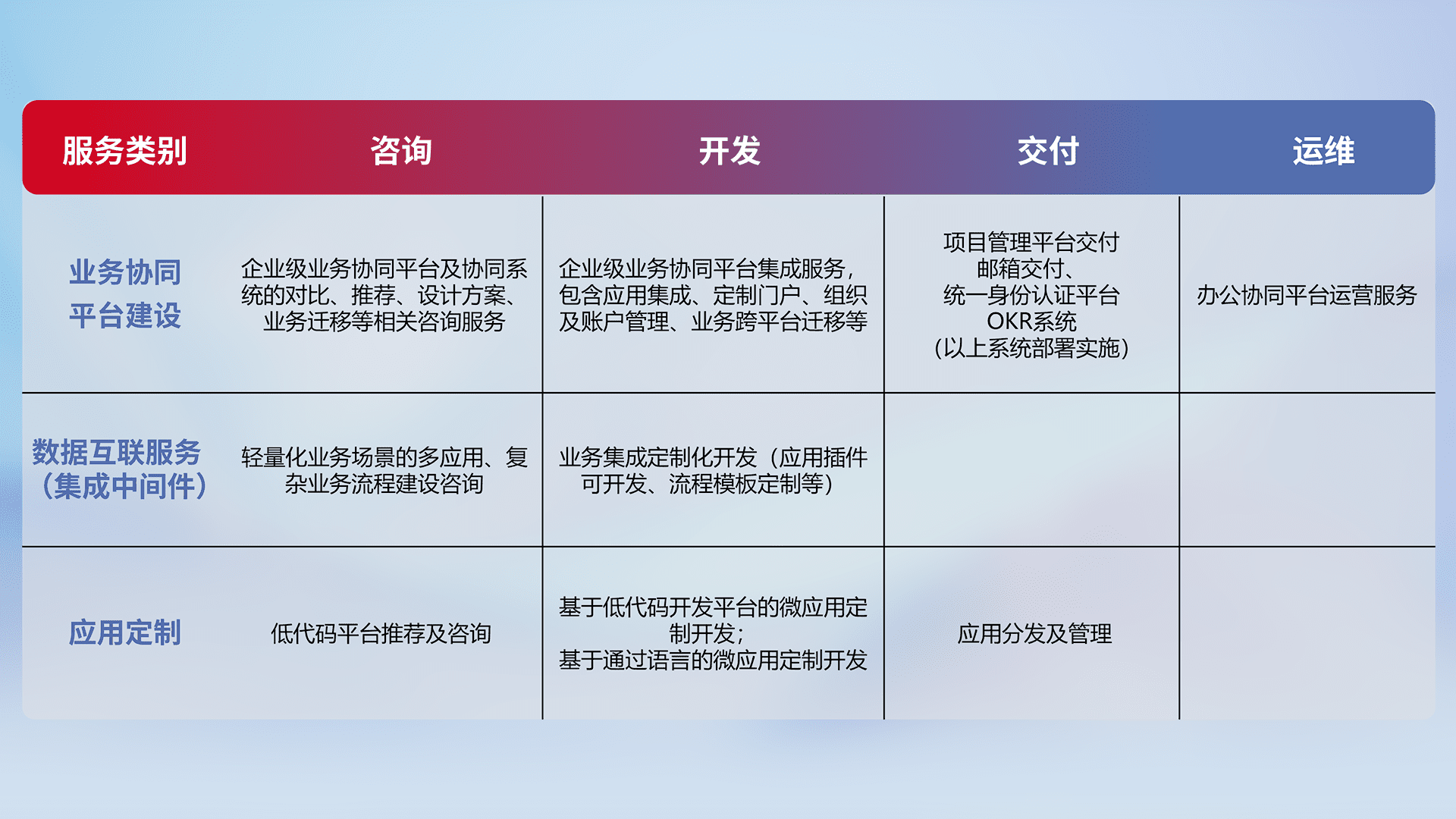针对钉钉、、、、企微、、IDaas等平台级产品提供产品的规划、、方案、、、、交付、、、定制化开发等服务,,,实现如统一协同办公、、、、智能客户服务、、、混合会议管理、、、智能数据查询、、、等业务场景,,,实现数字化转型。。